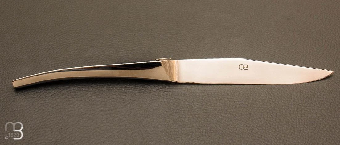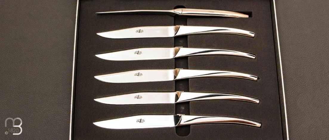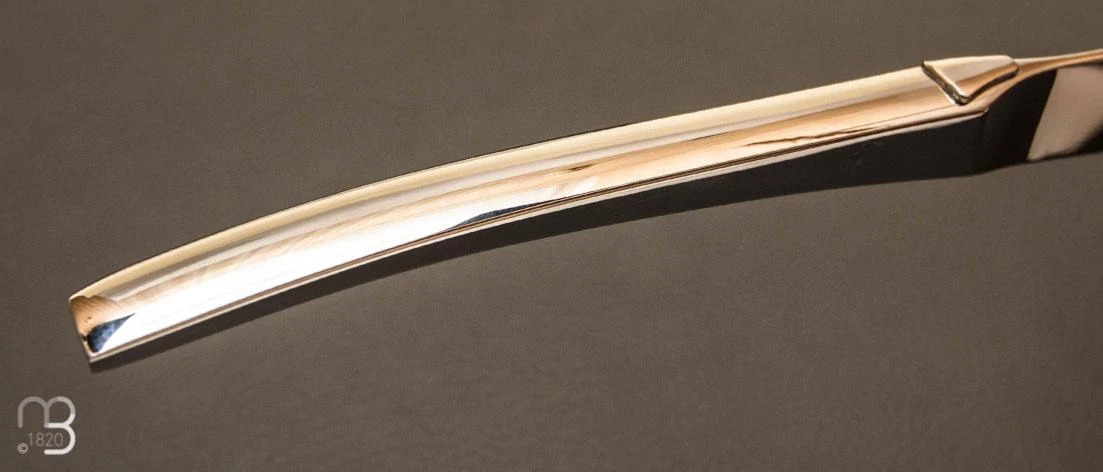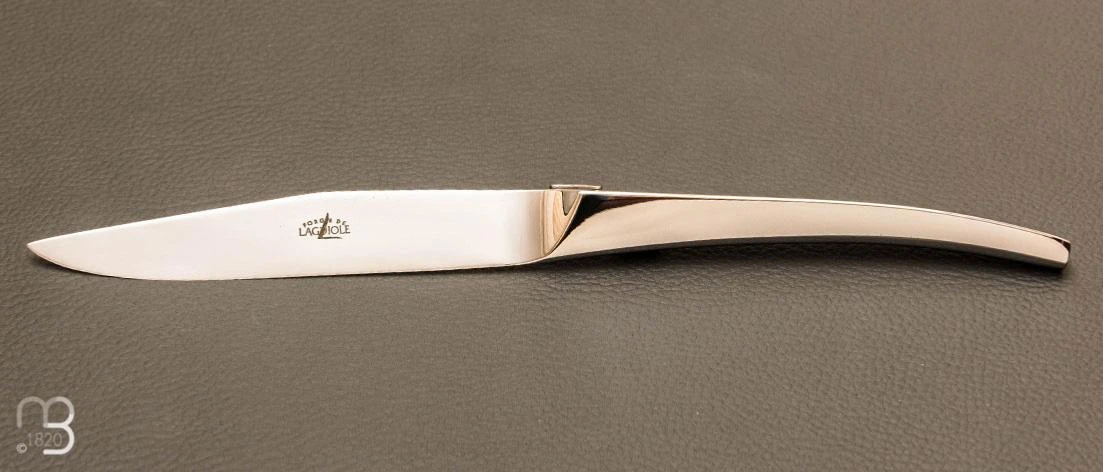 « Ce monobloc a une ligne sobre et élégante. La fameuse abeille du couteau de Laguiole est ici revisitée. Réalisé d’un seul tenant dans cet acier d’excellence, mélange de carbone, de molybdène et de vanadium forgé à 1080°, « Skel » présente une lame combinant l’avantage d’une tenue de coupe exceptionnelle à celui d’une résistance hors pair à la corrosion.Ce modèle est réalisé en association avec un forgeron français. La fabrication de « Skel » réclame sept opérations de forge et vingt opérations de finition. Le manche offre une prise en main particulièrement précise grâce à sa forme effilée et légèrement polygonale. Ce modèle est adapté à l’utilisation intensive des restaurants et passe au lave-vaisselle. »