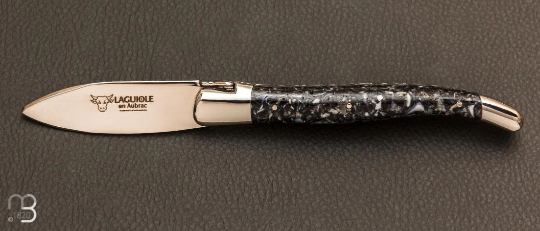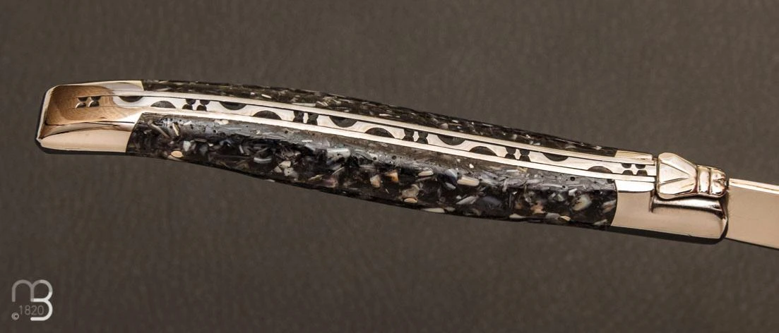 Manche en coquille de moule concassée et stabilisée avec de la résine, dos du couteau guilloché.