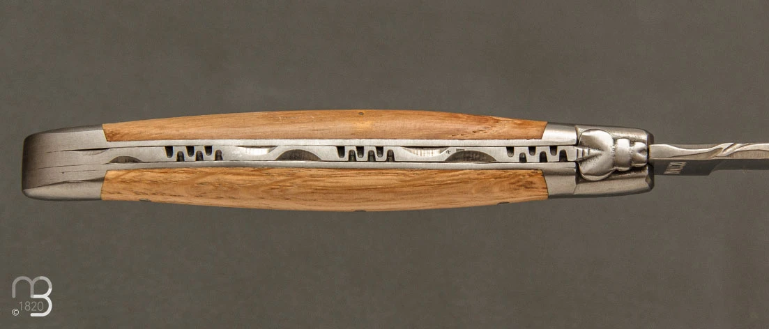 Lame avec onglet et ressort à mouche forgée guillochés.