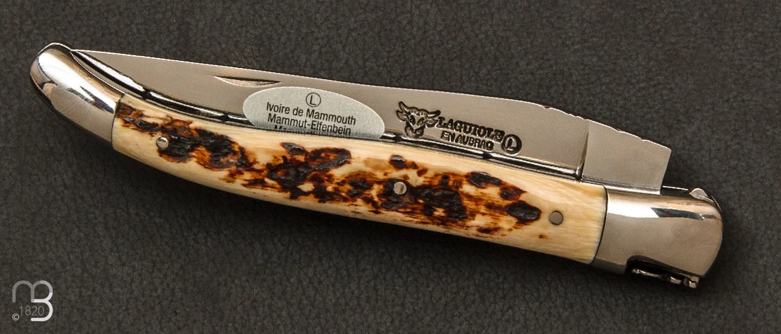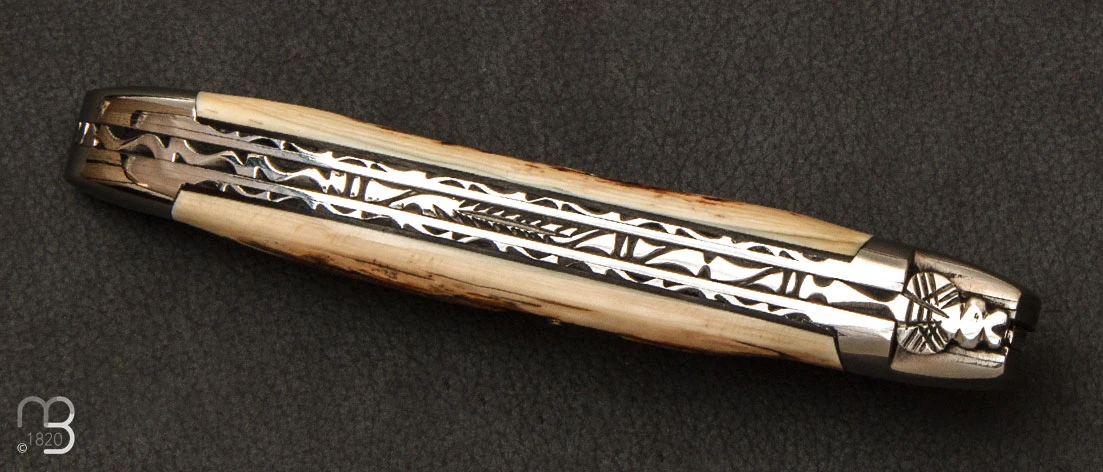 Mitres en acier inoxydable.Manche en ivoire de mammouth avec intercalaires noirs.