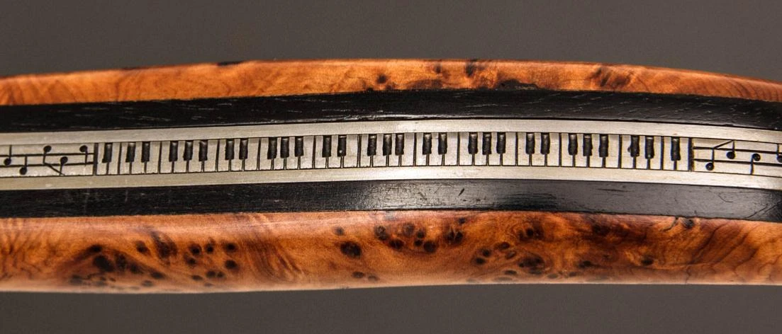 Le ressort est entièrement gravé et représente les touches d’un piano ainsi que des notes de musique.