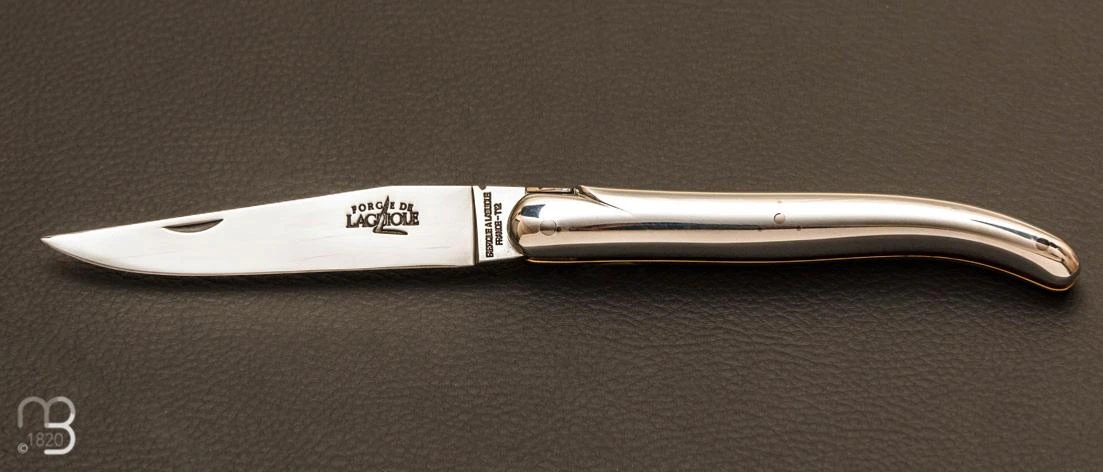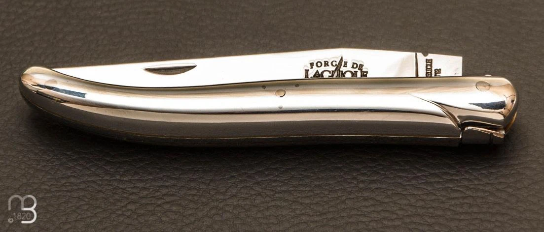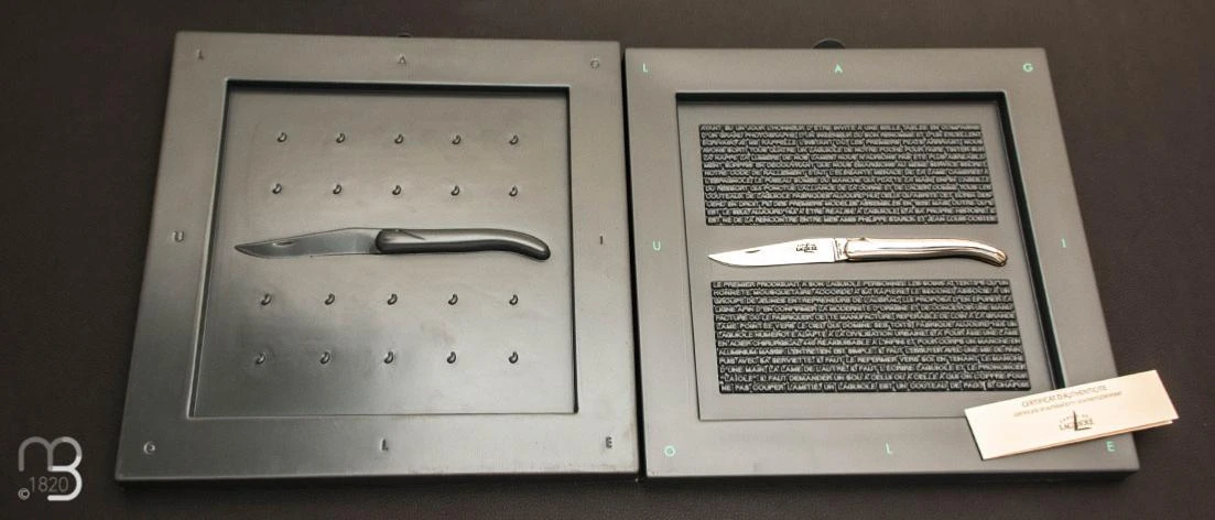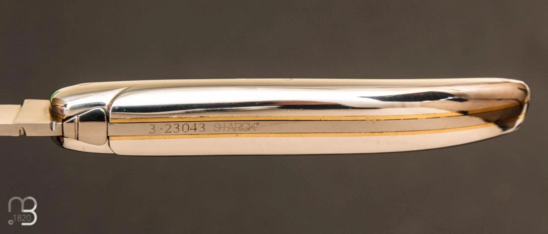 Couteau Laguiole par Forge de Laguiole. Cran forcé. Philippe Starck, célèbre architecte et designer français, a participé au projet de la Forge de Laguiole depuis ses débuts. Après avoir conçu en 1987 le bâtiment de la Forge de Laguiole puis les premières boutiques de la marque, il sera le premier à revisiter le couteau de Laguiole. L’aluminium poli et l’épuration des lignes donnent à ce couteau un côté résolument moderne. Dès sa sortie, il fut sélectionné par le Comité Colbert pour être exposé au Musée Cooper Hewitt, dans le cadre d’une exposition sur l’Art de Vivre en France de 1789 à 1989. Ces modèles font aujourd’hui partie de la collection permanente du Design au Musée d’Art Moderne de New York. Lame avec onglet acier T12 polie miroir. Longueur ouvert 210 mm. Longueur tranchant lame 85 mm. Longueur manche 110 mm. Manche en aluminium.