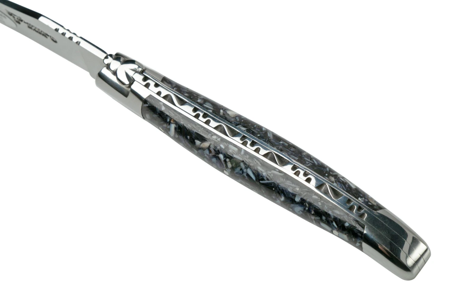 Le Laguiole en Aubrac Mussel est une version moderne du couteau Laguiole classique. Ce couteau se compose d’un manche très particulier en coquilles de moules broyées, avec une mitre et un tranchant polis. Chaque couteau de poche est fabriqué à la main pour garantir une finition des plus incroyables.